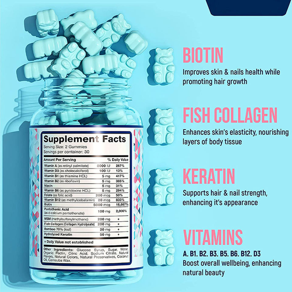 Ingrediente Principal:Colágeno, Biotina, Ácido Hialurónico, Vitamina C, Vitamina E, Zinc