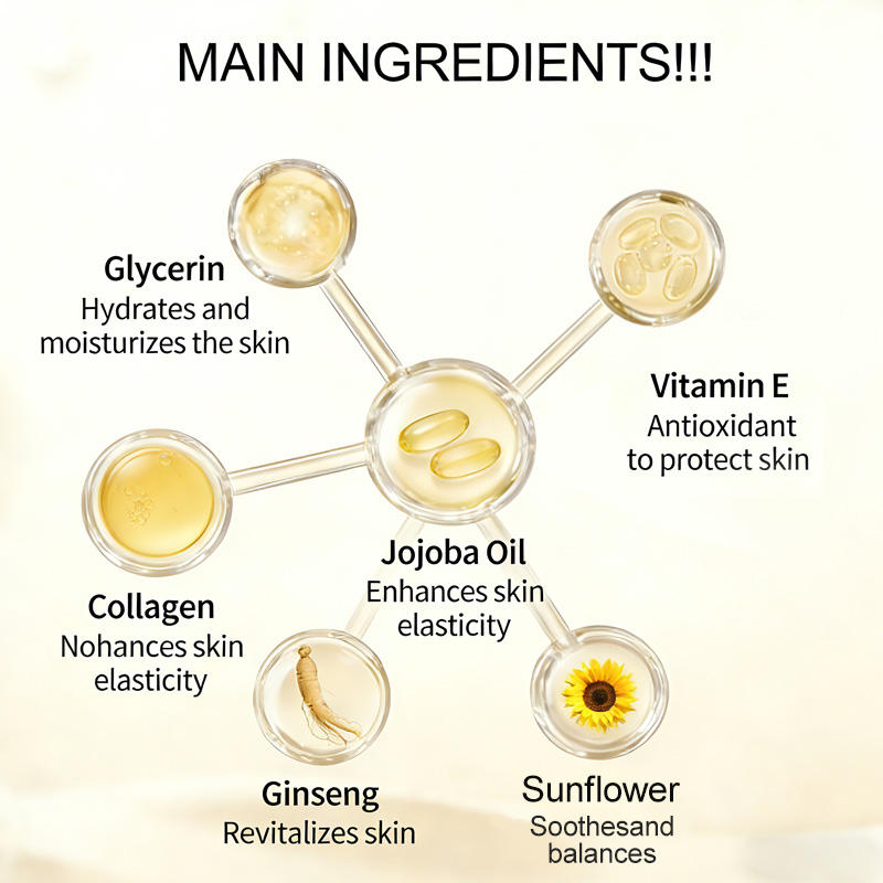 Ingredient:Glycerin,collagen,ginseng,sunflower,vitamin e,retinol,vitamin c