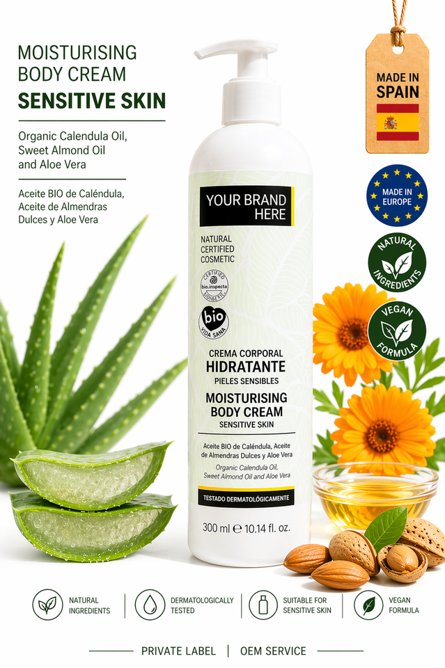 Crema Corporal para Piel Sensible de Marca Privada 300ml OEM | Crema Hidratante Calmante | Vegano Orgánico | Hecho en España Proveedor de la UE
