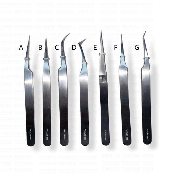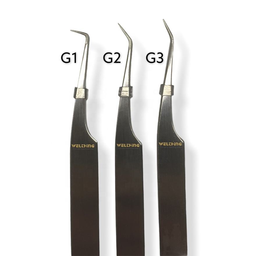 Pinzas de extensión de pestañas de acero inoxidable con etiqueta privada, Punta puntiaguda probada a mano, herramienta de belleza de aislamiento de volumen clásico