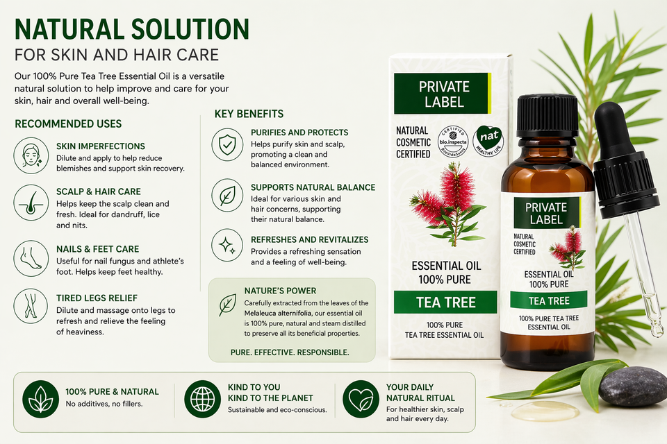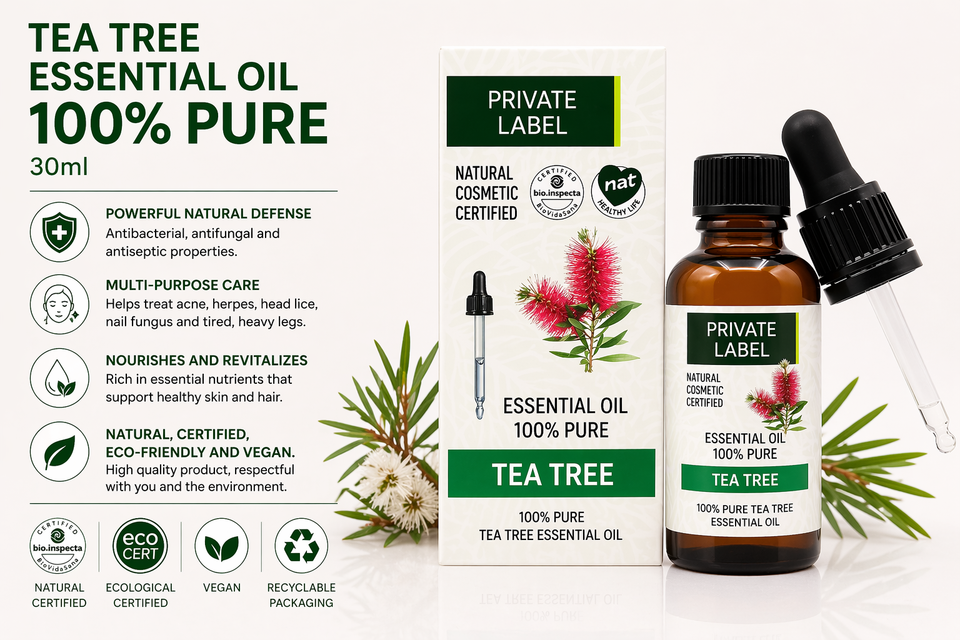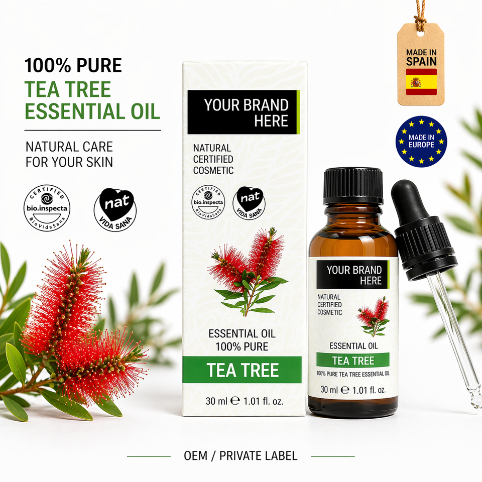 Aceite Esencial de Árbol de Té de Marca Privada 30ml OEM | Aceite 100% Puro para el Tratamiento del Acné con Propiedades Antibacterianas | Vegano Orgánico | Hecho en España, UE