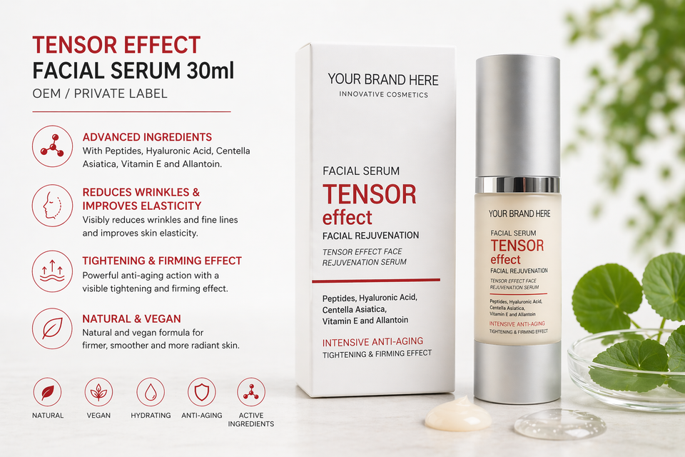 Suero Facial con Efecto Tensor de Marca Privada 30ml OEM | Ácido Hialurónico, Péptidos y Centella | Reafirmante Antienvejecimiento | Hecho en España, UE