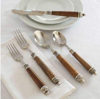 Juego de cubiertos de acero inoxidable con mango de madera, ideal para comidas diarias y una organización elegante de la mesa.