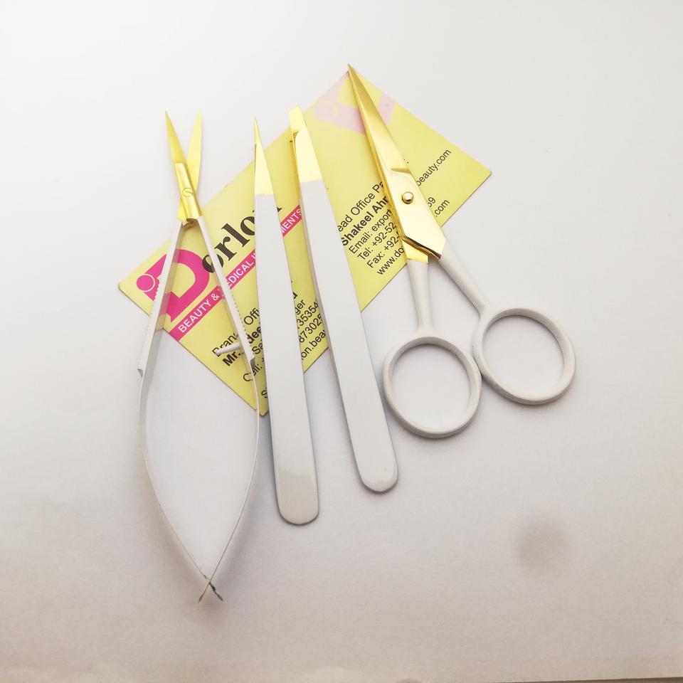 Juego de tijeras de pinzas para cejas de acero inoxidable de oro blanco puntiagudo con logotipo privado