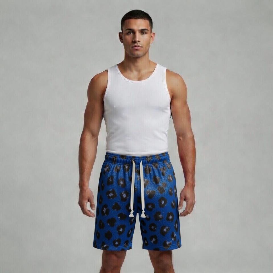 Pantalones Cortos Deportivos Unisex de Malla con Sublimación de Leopardo Azul, Estilo Casual con Estampado Animal y Cordón Ajustable