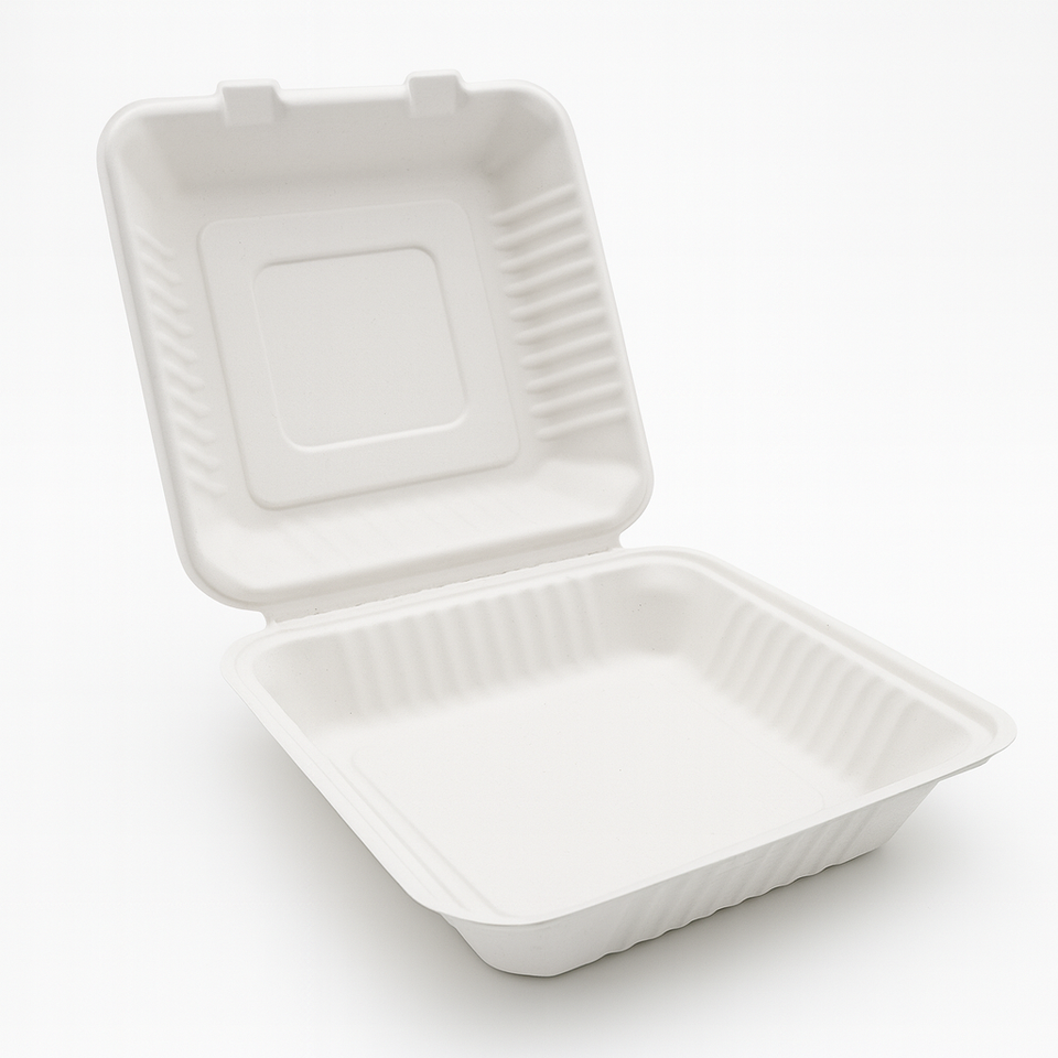 ProTakeOut, Paquete de 200 Contenedores con Bisagras de Bagazo [9 x 9] (100/2) – Sin PFAS, Blancos, Compostables, Aptos para Microondas y Duraderos