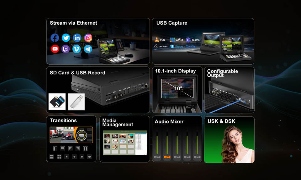 Mezclador de Video HDMI Profesional de 4 Canales con Pantalla IPS de 10.1 Pulgadas para Transmisión en Vivo y Producción