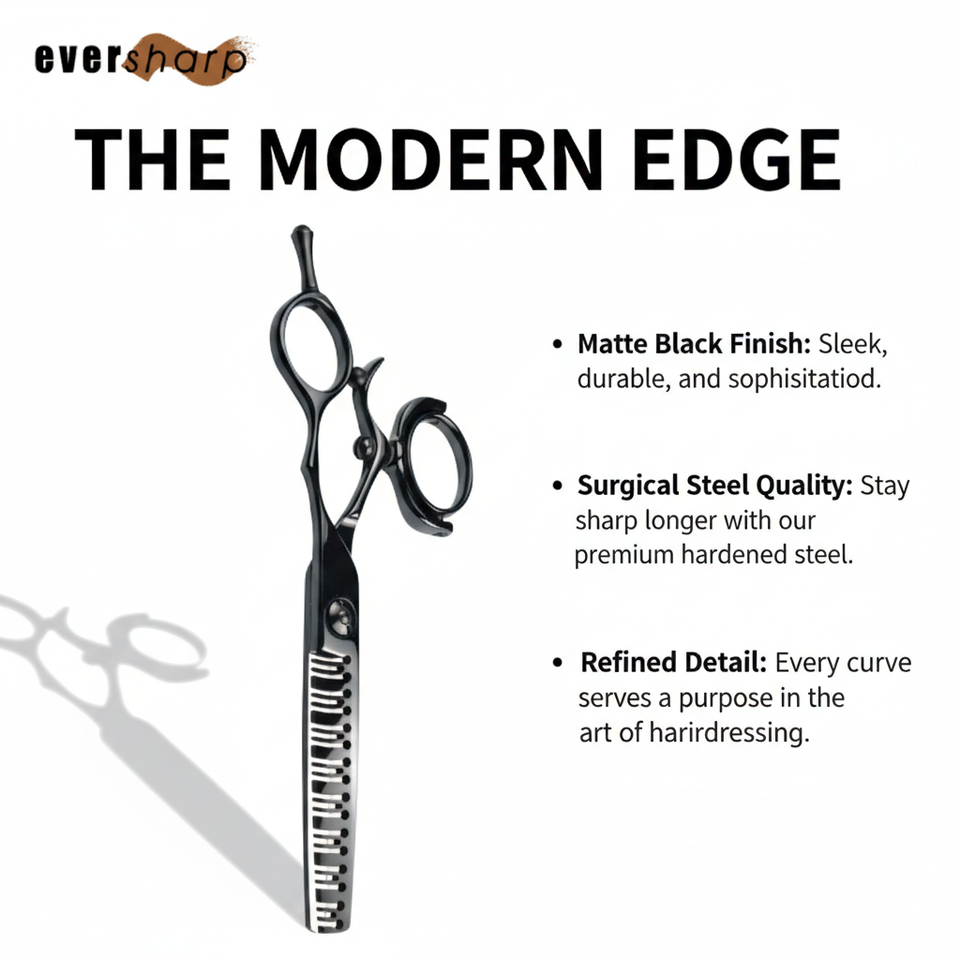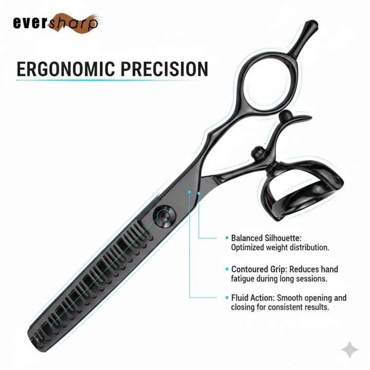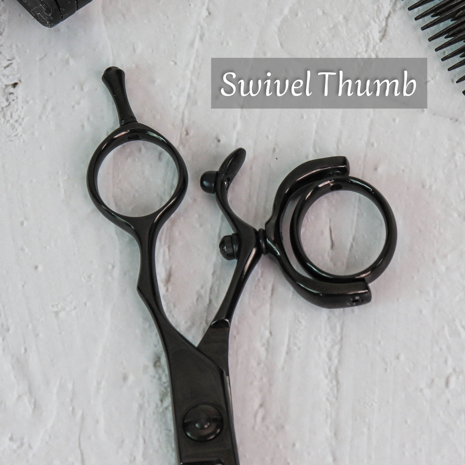 Tijeras de Entresacar Profesionales para Salón y Barbería, para Zurdos, con Mango Giratorio Desplazado de 5.5 Pulgadas, Hoja Convexa con Recubrimiento de Titanio, 440C 24T