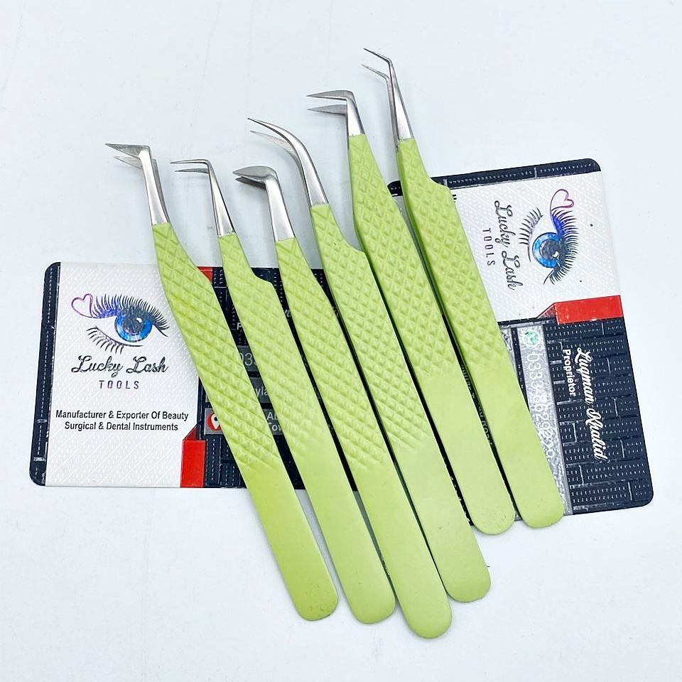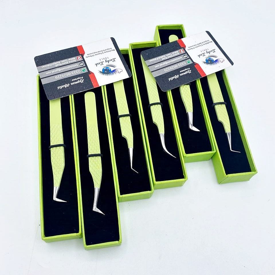 Pinzas profesionales de tema de verano de volumen ruso de 90 grados, punta de fibra verde para extensión de pestañas, embalaje de caja verde personalizado