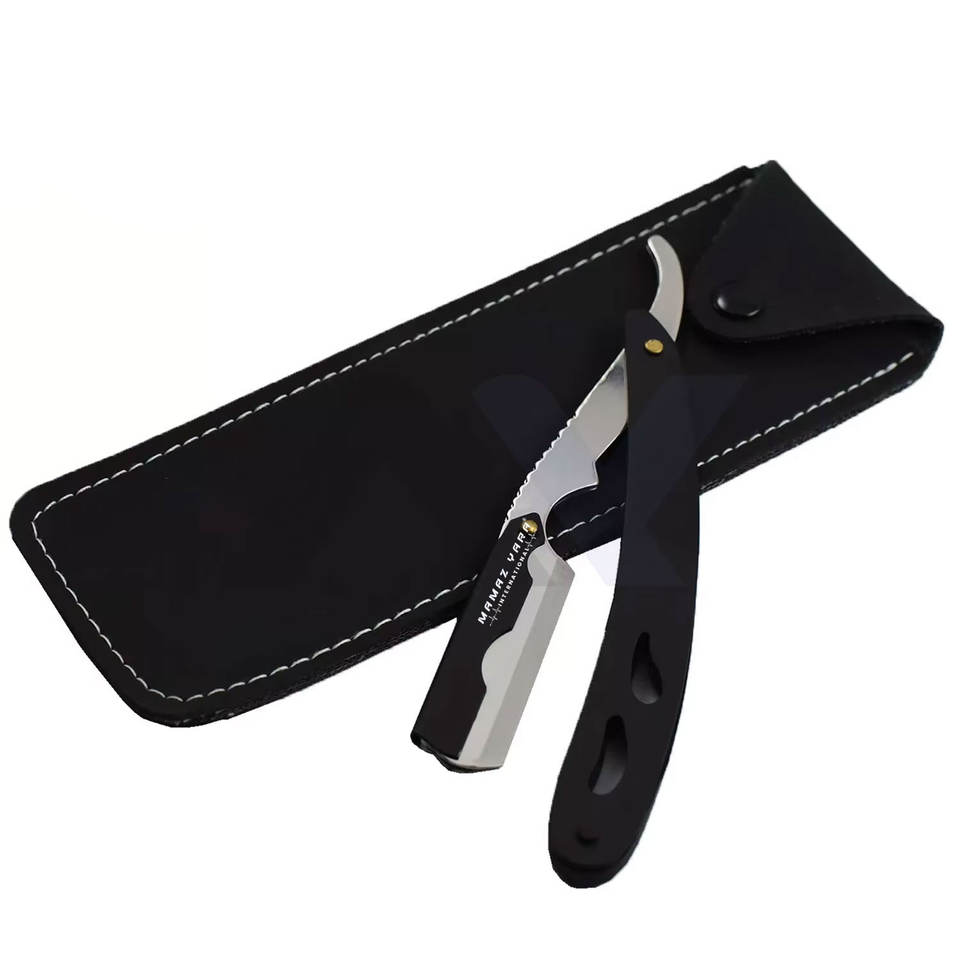 Navaja de Afeitar Profesional para Barbería con Bloqueo Giratorio, Cuchilla Recta Plegable en Negro y Plateado
