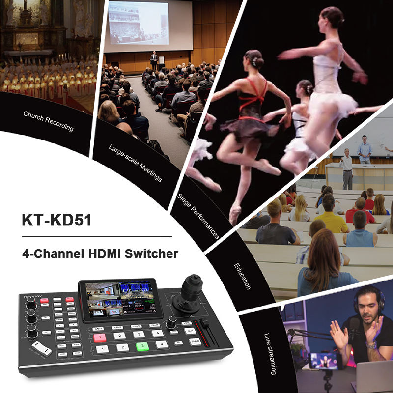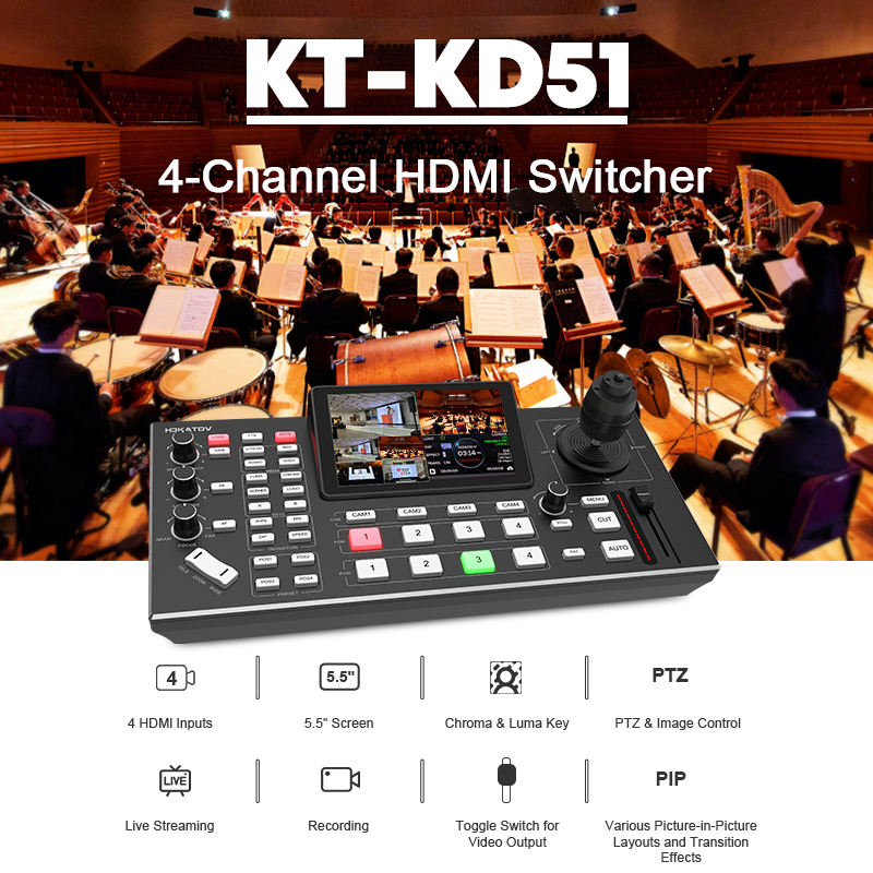 Mezclador de video mágico negro profesional, transmisión en vivo, 4 canales de video, pantalla LCD FHD de 5,5 pulgadas, conmutador de video con control PTZ