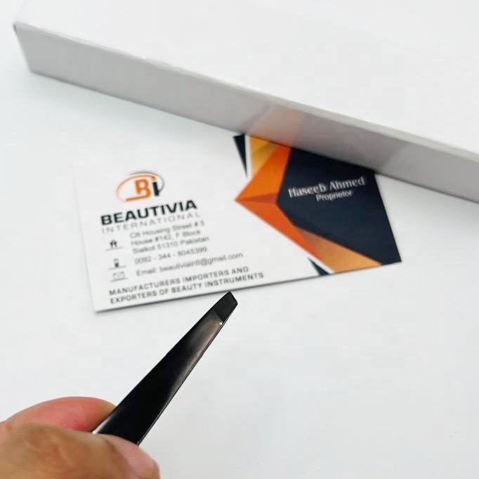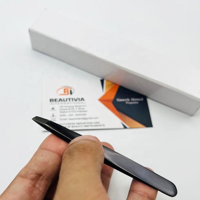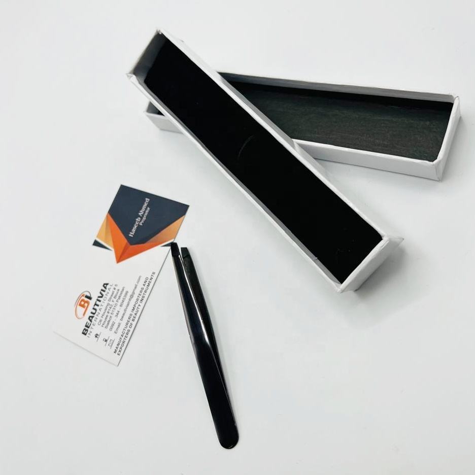 Pinzas Profesionales para Cejas de Acero Inoxidable Negro con Punta Inclinada, Diseño Ecológico y Duradero, Empaque Personalizado para Depilación