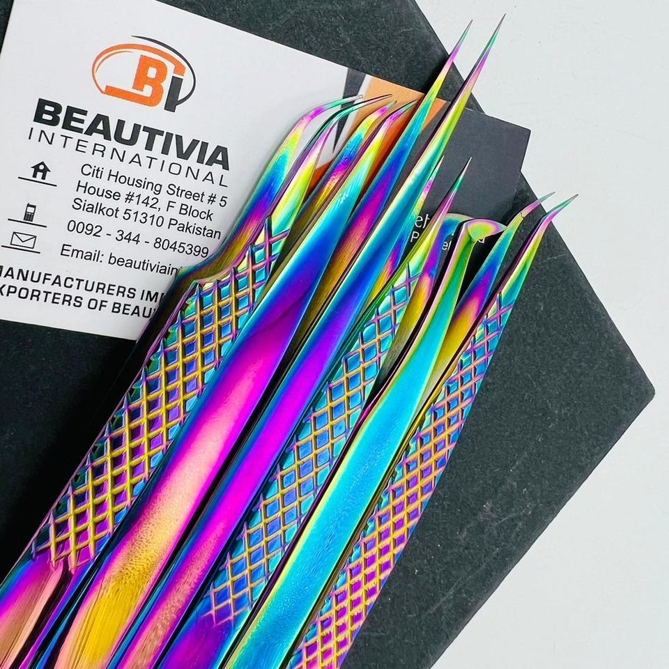 Pinzas para pestañas de acero inoxidable con logotipo grabado personalizado profesional Agarre fuerte Plasma de arco iris Acero sostenible Pestañas puntiagudas