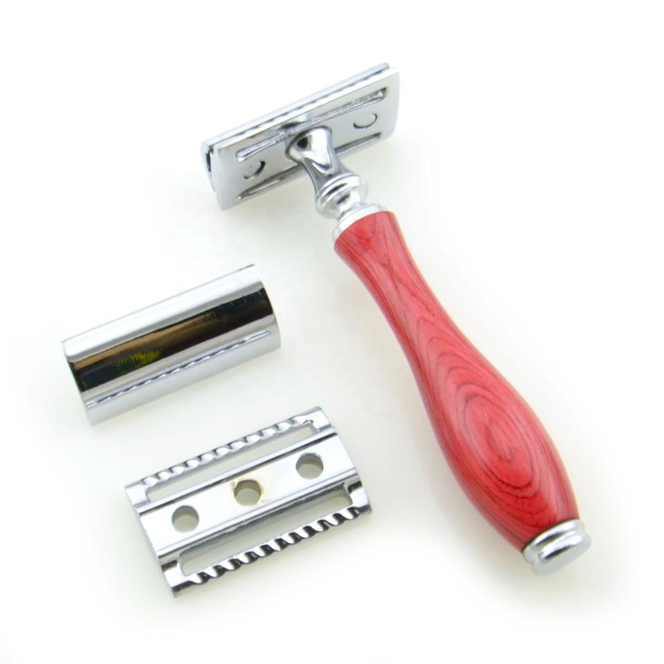 Maquinilla de afeitar de seguridad profesional de doble filo con mango de madera natural duradera sostenible para hombres y mujeres en rojo