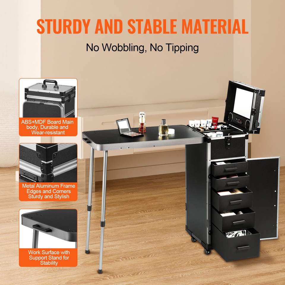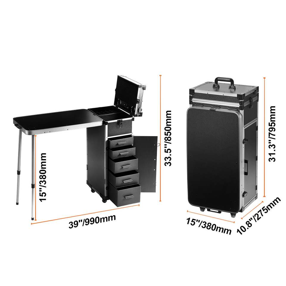 Maleta de Maquillaje Profesional Extra Grande con Ruedas y Patas de Soporte, Banco de Trabajo Cosmético de Aluminio, Carrito de Maquillaje Portátil