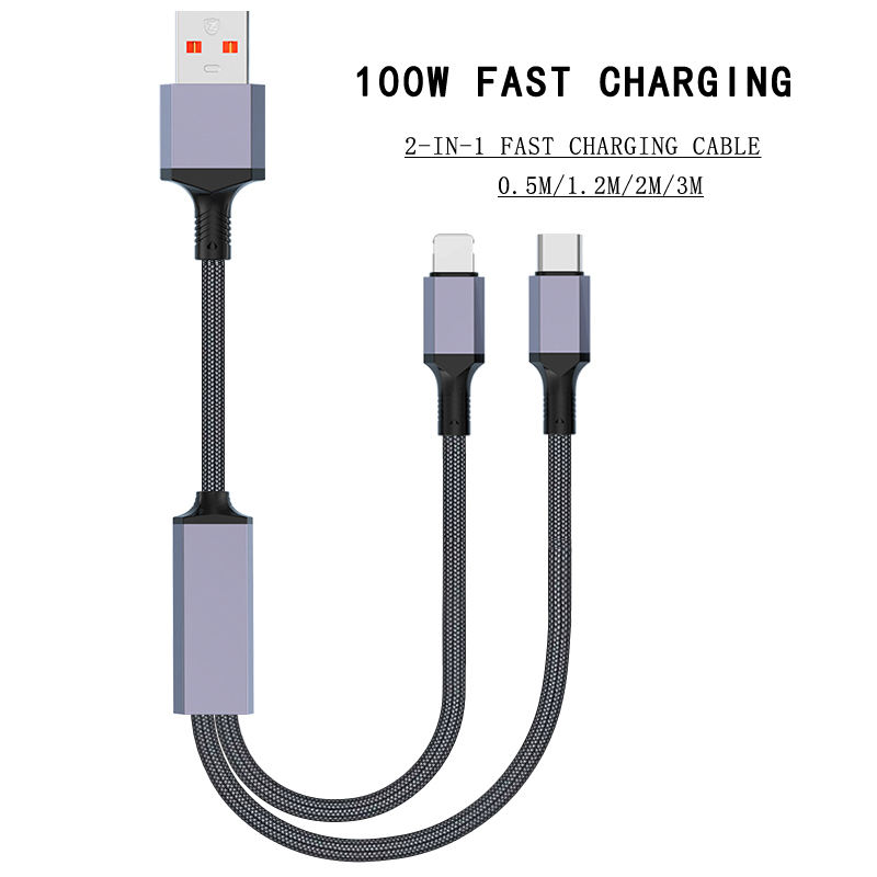 Cable de Carga Rápida Profesional de Fábrica de 100 W, 0.5/1.2/2/3 Metros, Cable de Carga USB 2 en 1 para iPhone y Samsung, Cable de Datos Trenzado