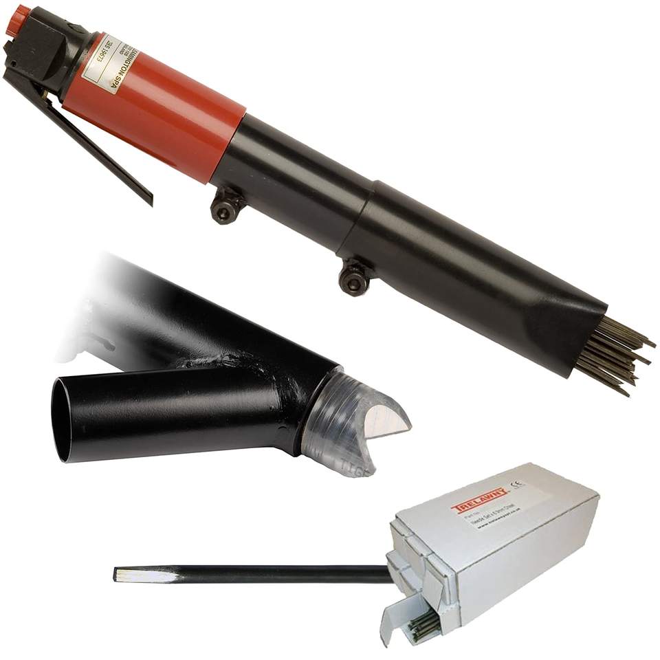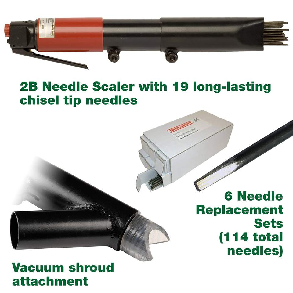 Kit Básico Profesional de Pulidores Neumáticos de Aire Comprimido con Agarre en Línea, 5.5 CFM, con Cubierta de Vacío de 19 Agujas y 6 Juegos de Cinceles Neumáticos
