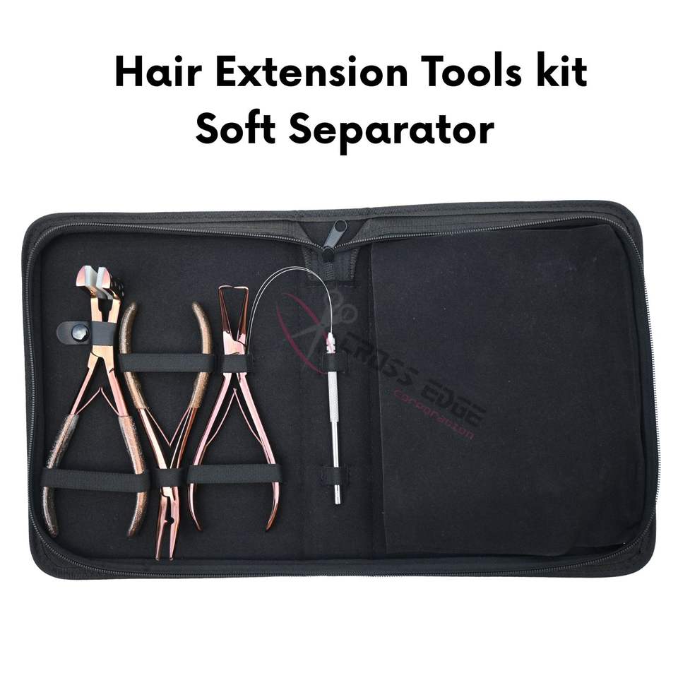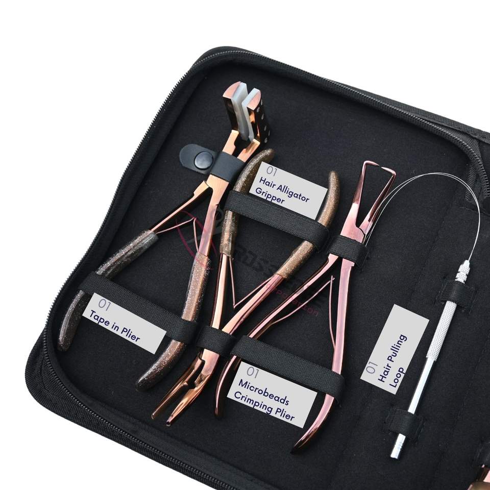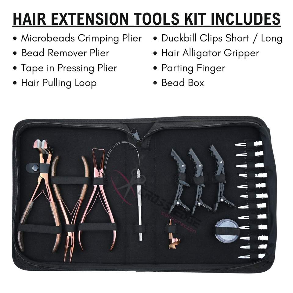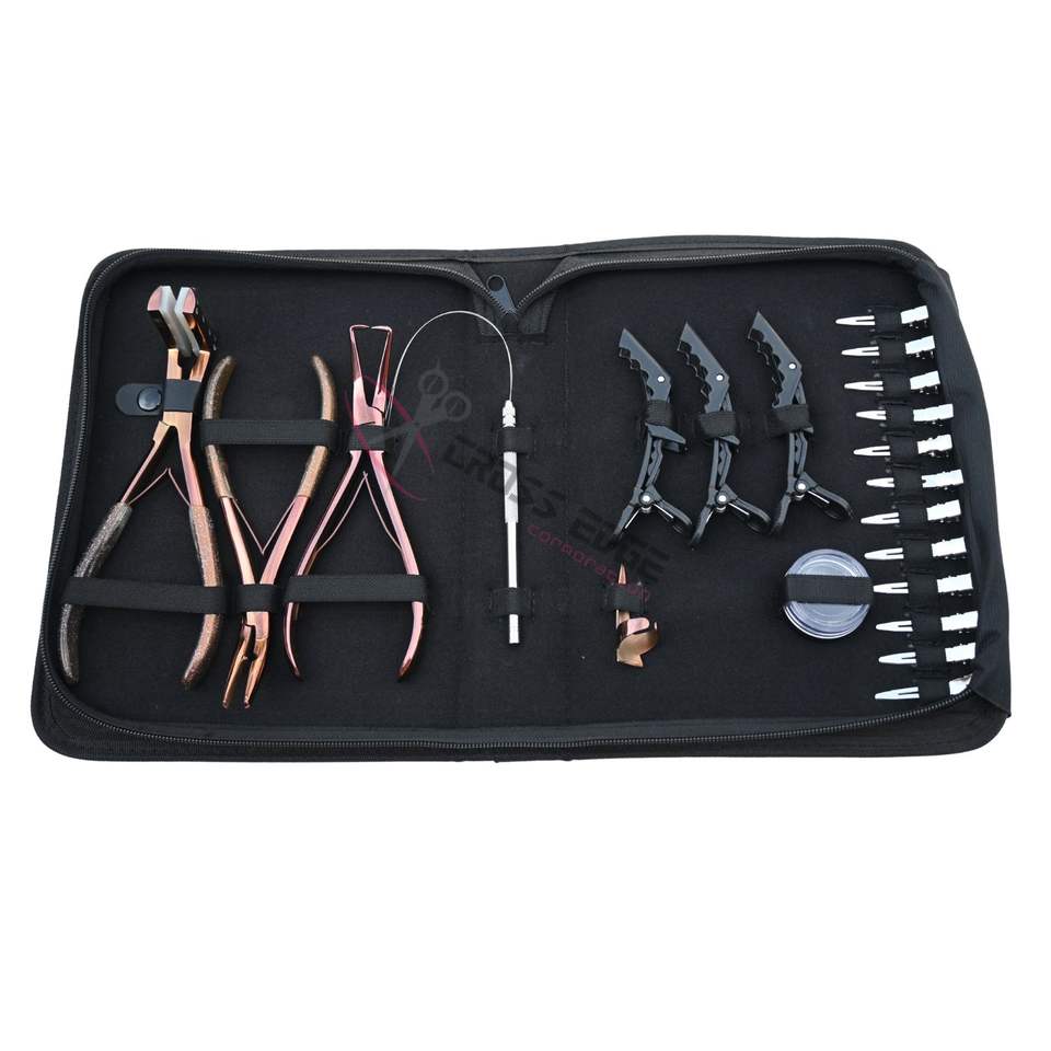Kit profesional de extensiones de cabello con cinta adhesiva, tenazas de presión y cuentas.