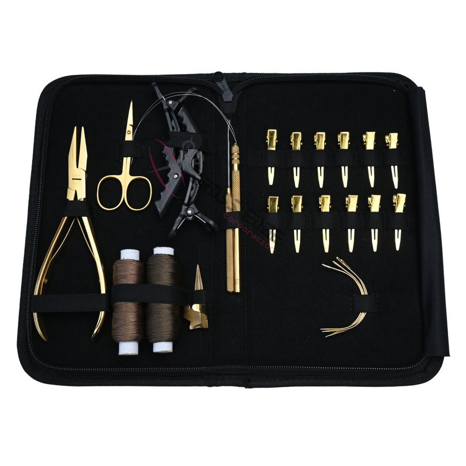 Paquete de herramientas para extensiones de cabello con pinzas de cocodrilo doradas