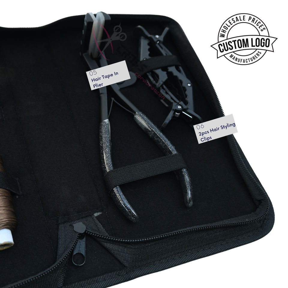 Nombre:Kit de herramientas para extensiones de cabello con alicates negros de 7 pulgadas para cinta adhesiva