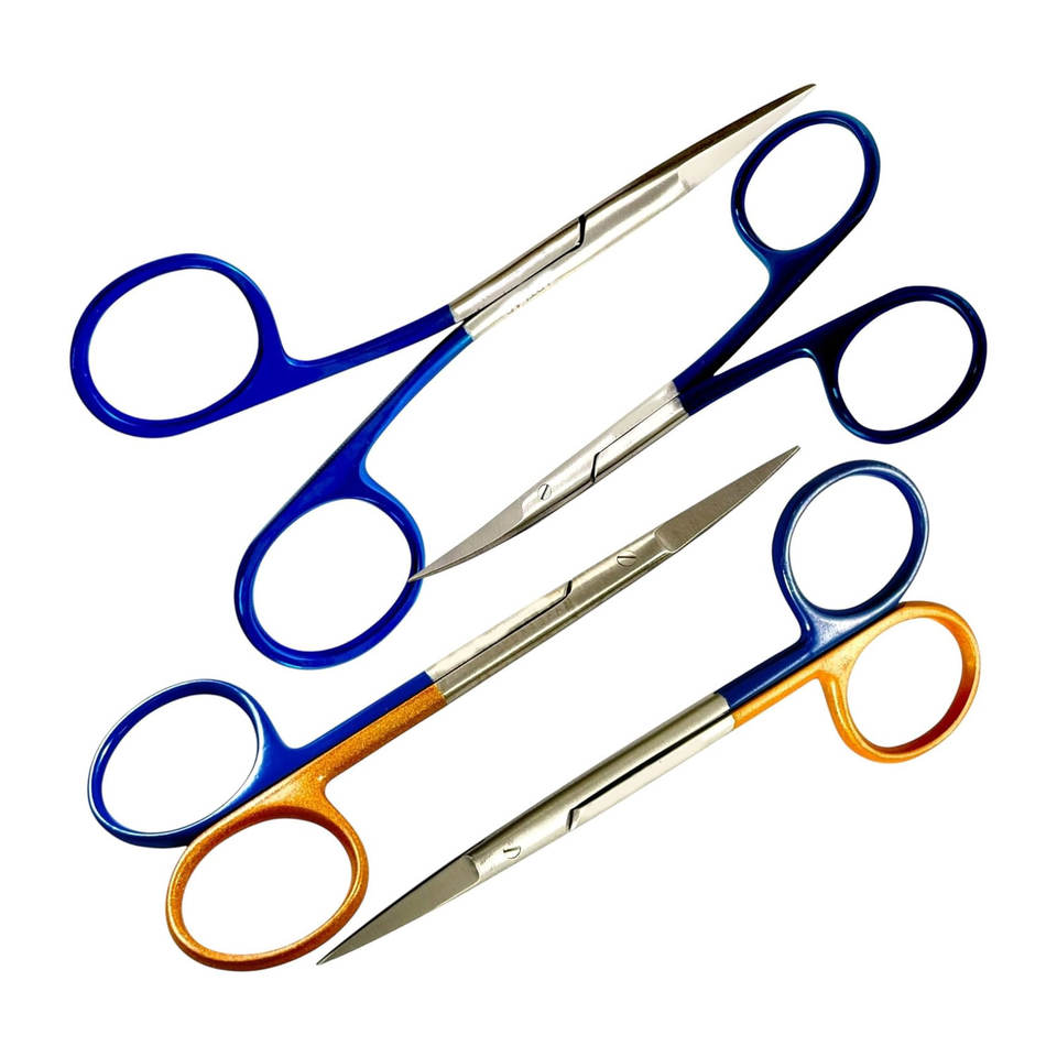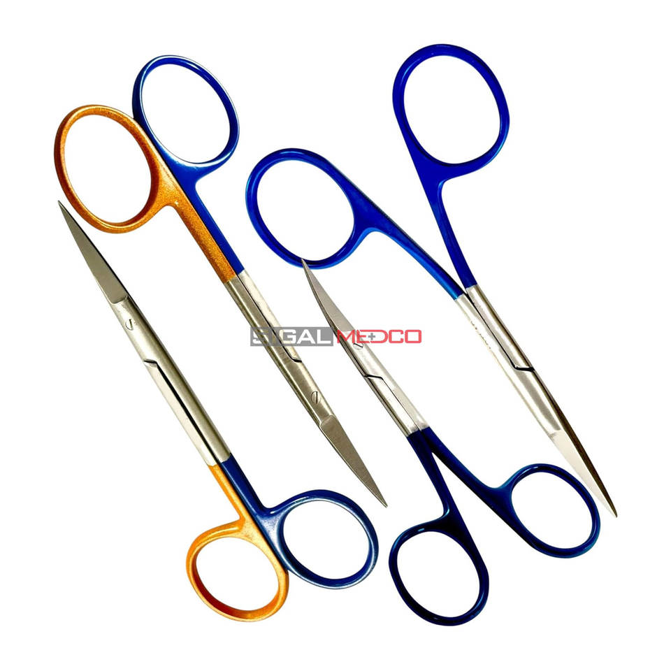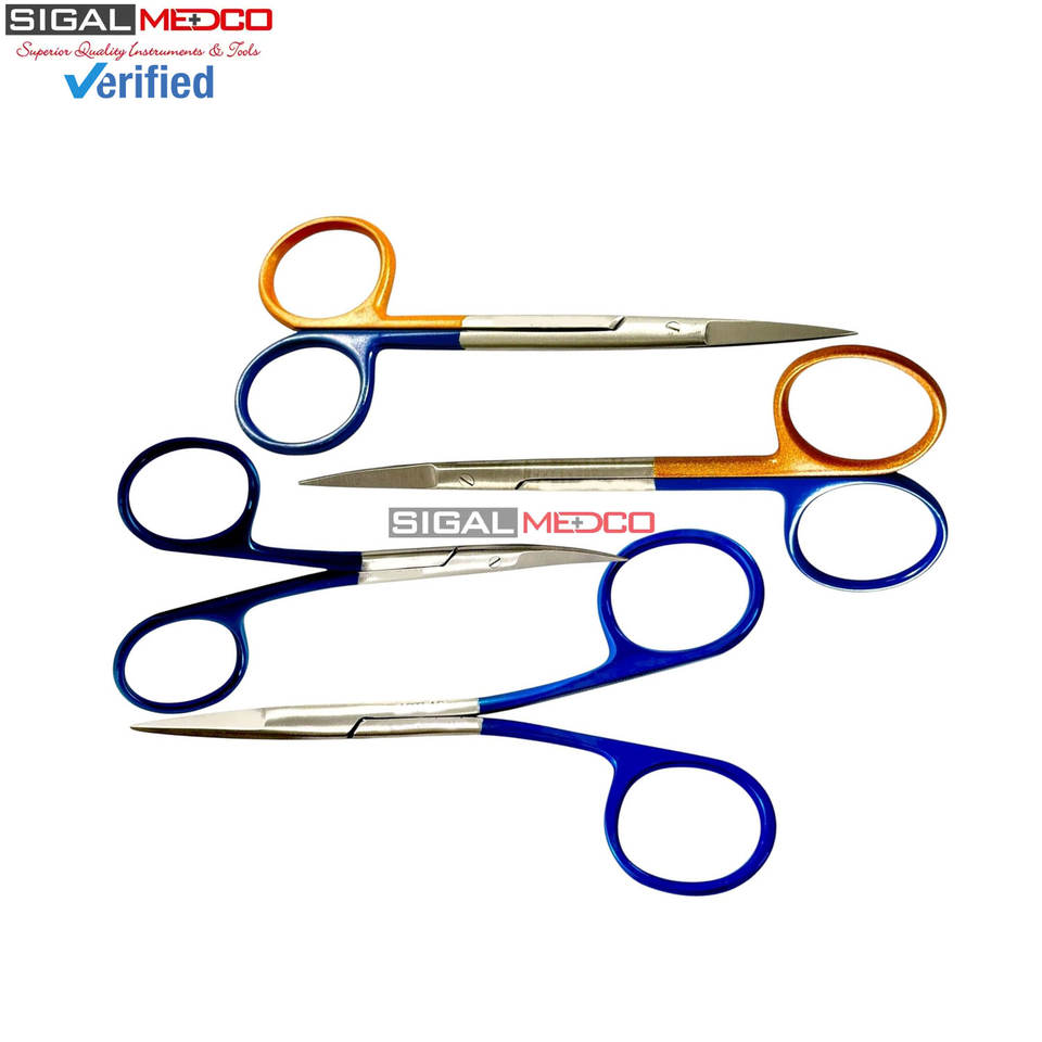 Tijeras Quirúrgicas Manuales Profesionales para Iris, 4.5 Pulgadas, Puntas Afiladas, Hojas Curvas y Rectas, Mango con Código de Color, Certificación CE Alemana
