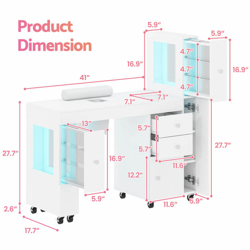 Mesa de Manicura Profesional con Diseño Ergonómico, Colector de Polvo Incorporado, Mesa de Manicura Rodante con Gabinetes con Pantalla LED