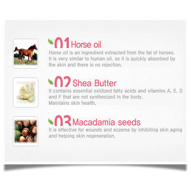 Butilenglicol, Agua purificada,, Glycereth-26, aceite de caballo, manteca de karité, cetearyl Alc, Glicerina, Cetearyl glucósido, NiacinamidaIngrediente principal