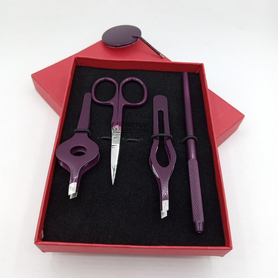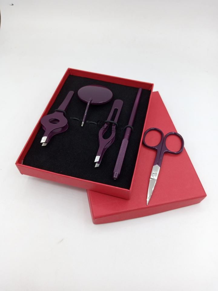 Pinzas de Cejas Profesionales de Lujo con Recubrimiento de Polvo de Vino, Diseño Curvo, Kit de Tijeras de Acero Inoxidable, Espejo Circular, Belleza