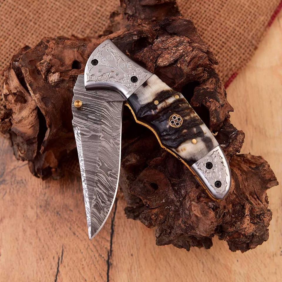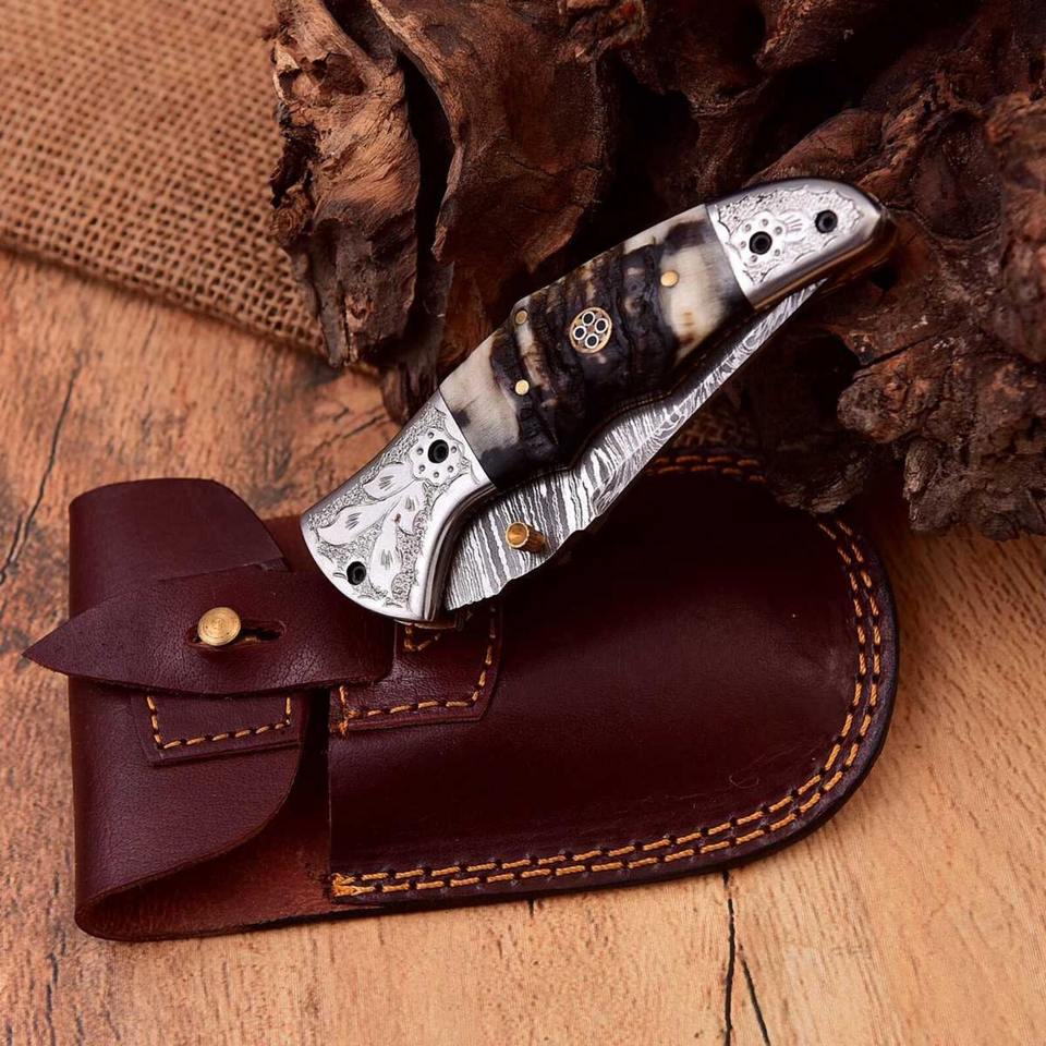 Cuchillo de bolsillo profesional para caza al aire libre, cuchillo plegable de acero de Damasco japonés con mango de cuerno de ciervo, hoja de acero D2 a la venta.
