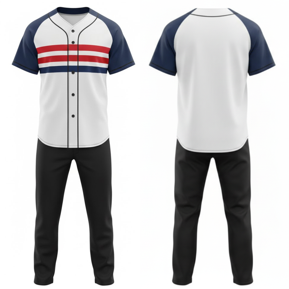 Uniforme de Béisbol Profesional con Mangas Raglán, Jersey Blanco con Rayas Rojas/Azul Marino en el Pecho y Pantalones Negros de Alto Rendimiento