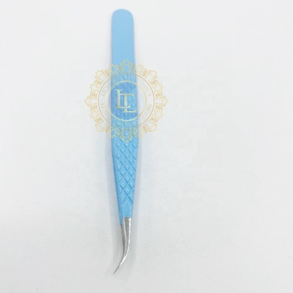 Pinzas profesionales de punta plateada de acero inoxidable para extensión de pestañas, etiqueta personalizada, polvo azul cielo probado a mano sostenible