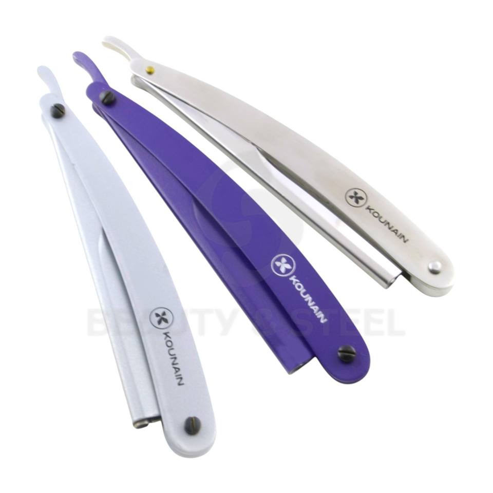 Juego de Navajas de Barbero Profesionales de Hoja Recta con Acabado Plateado y Morado y Mangos Ergonómicos de Acero Inoxidable Pulido