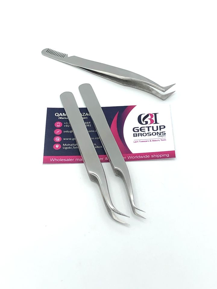 Estilo profesional, 45 grados, bota plateada, volumen, peine, pinzas para extensión de pestañas, acero inoxidable curvo, logotipo personalizado, herramientas de belleza