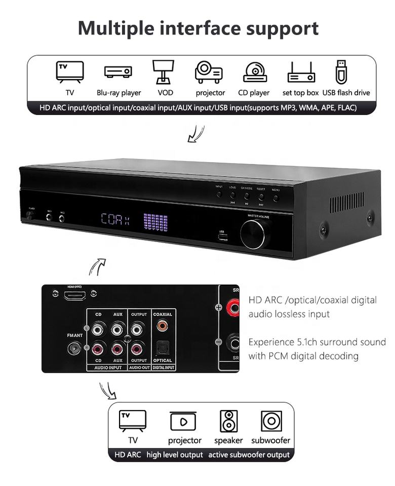 BT5.0/HD ARC /DAC/USB/AUX/Óptico/Coaxial/FM/CD/2 MIC/
