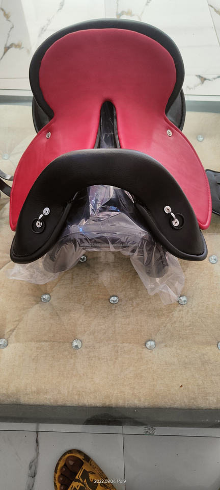 Silla de montar profesional sintética estilo inglés para entrenamiento, con doble banda abdominal y estructura de madera/plástico, para resistencia.