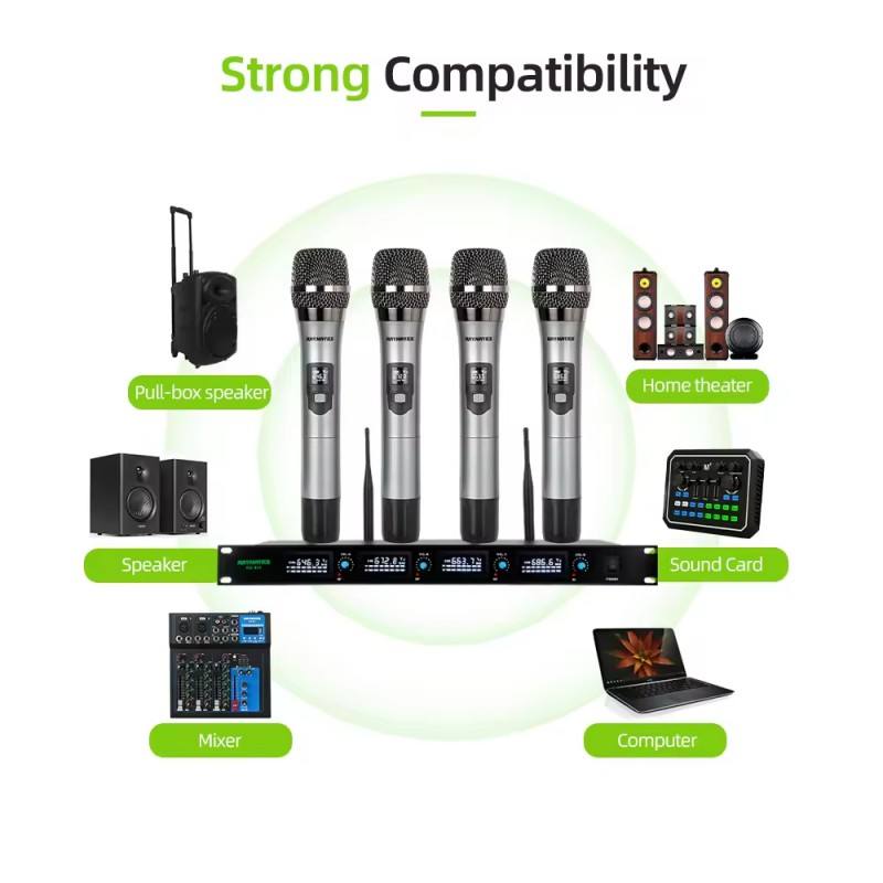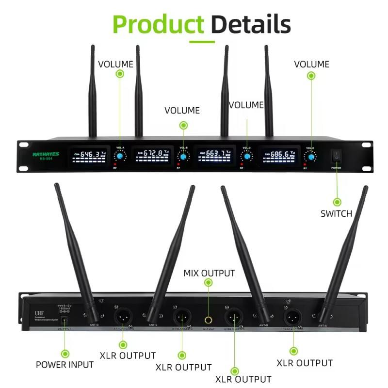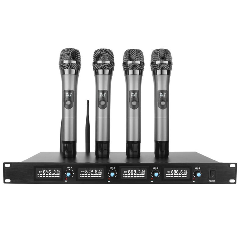 Sistema de Micrófono Inalámbrico UHF Profesional, 4 Micrófonos, Montaje en Rack, Múltiples Antenas, Señal Estable, Sistema PA, Instalación para Conferencias, Sonido
