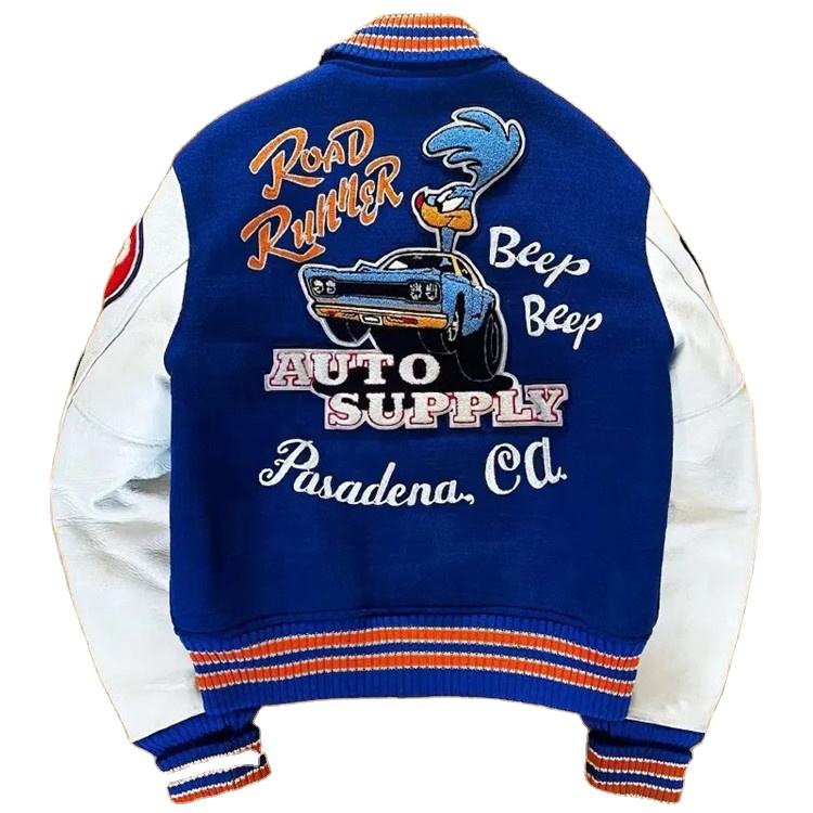 Chaqueta Universitaria Retro Azul y Blanca con Capucha, Bordada y Diseñada Profesionalmente, Chaqueta Varsity Formal Delantera, Impermeable