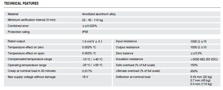Deflection at nominal load:0.43 mm (22 kg), 0.7 mm (45 kg), 0.4 mm (110 kg)