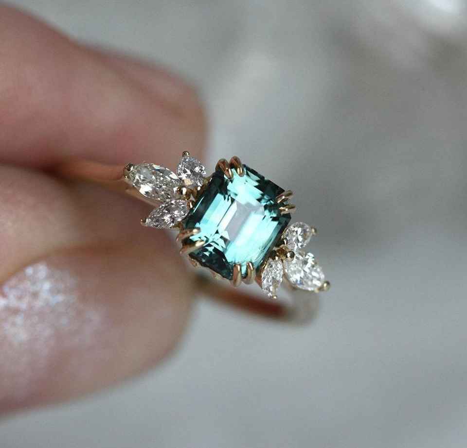 Promise Fine Jewelry Esmeralda Corte Verde Azul Teal Zafiro Con Marquesa Corte Diamantes Anillo de compromiso En Anillo de oro amarillo Regalo
