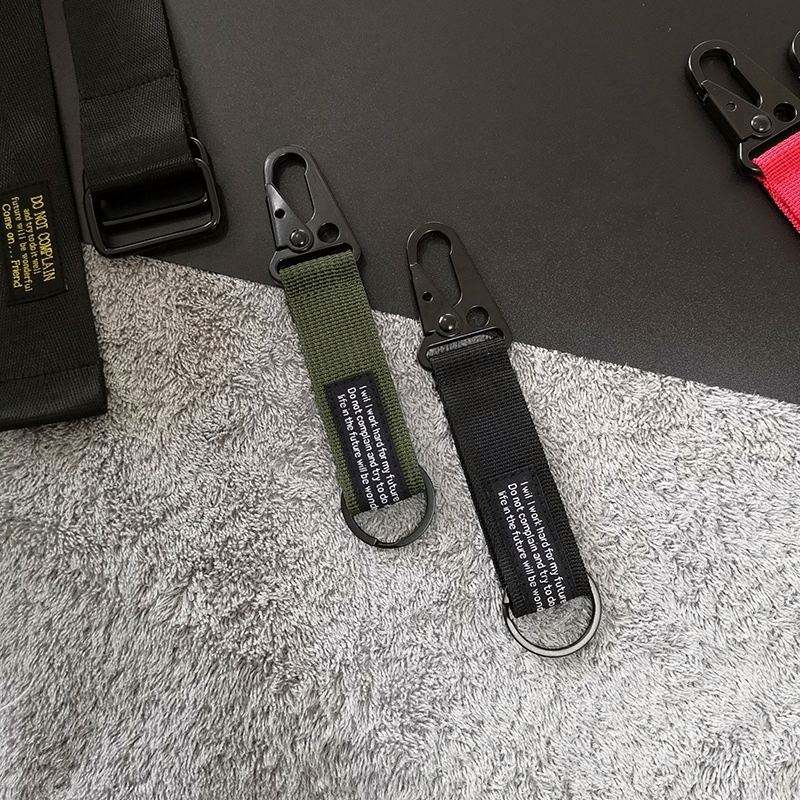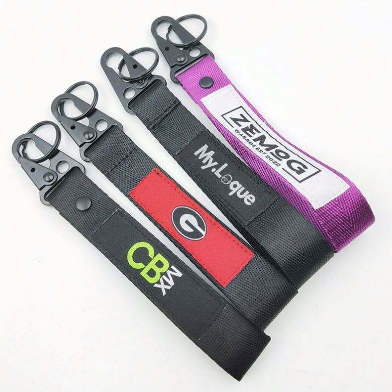 Llavero promocional personalizado con logo bordado negro, para motocicleta, aviación, escalada, con mosquetón y etiquetas de nailon.