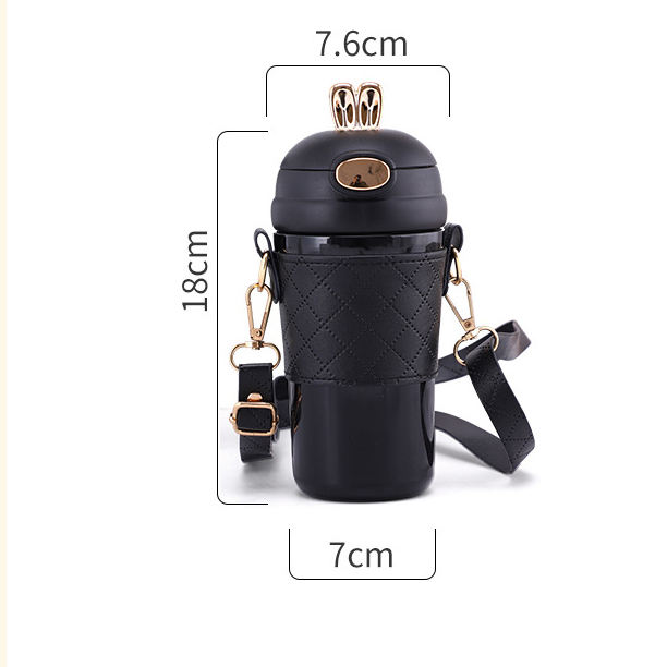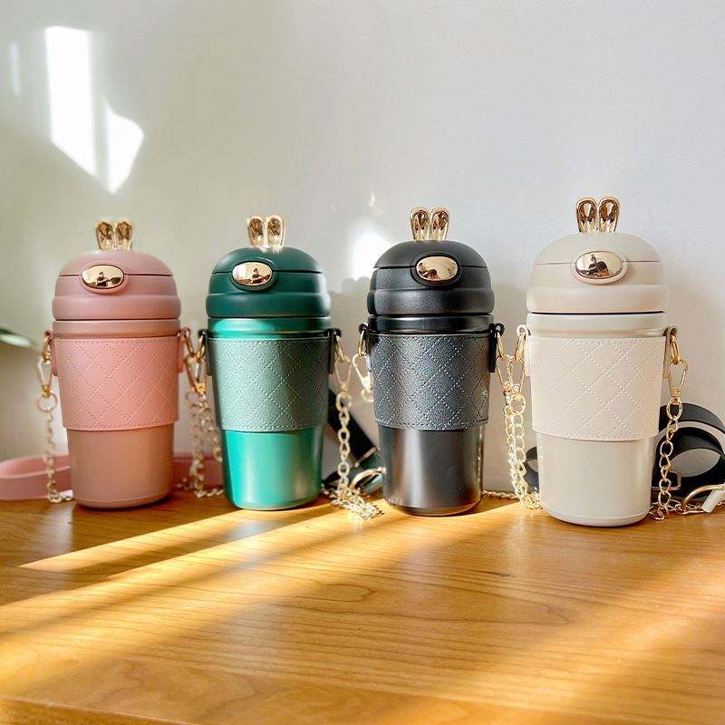 Taza Térmica de Acero Inoxidable con Orejas de Conejo de Pascua, con Funda de Cuero PU y Correa de Hombro Cruzada