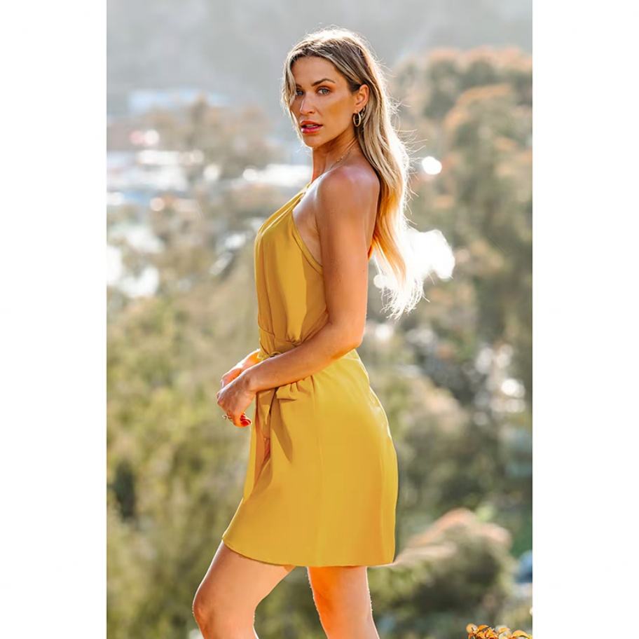 Vestido Mini Corto Promocional de Color Sólido con Hombro Descubierto, Lazo Asimétrico en la Cintura y Lazos Decorativos