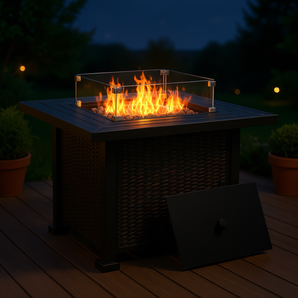 Mesa de fuego de gas propano de 34 pulgadas con diseño de mimbre, protector de viento de vidrio, tapa de rocas de lava, para uso en exteriores