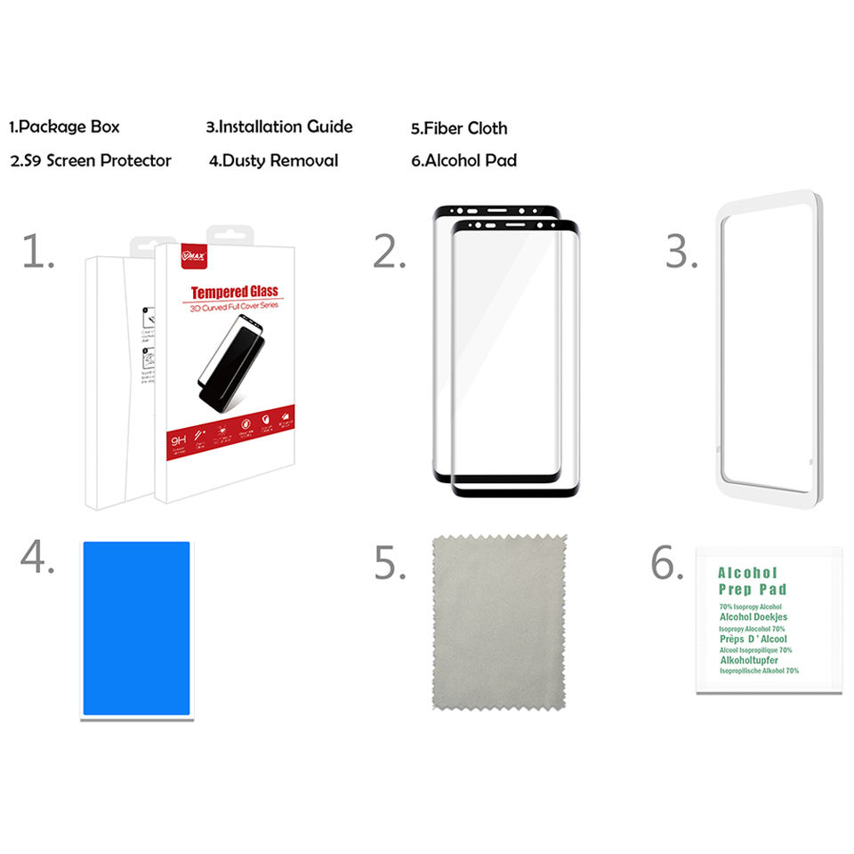 Detalles del embalaje:1 * protector de pantalla de cristal templado delantero + 1 * almohadilla de preparación de Alcohol + 1 * guía de instalación + 1 * removedor de polvo + 1 * paño de compensación de Fiver + 1 * Etiqueta de botón