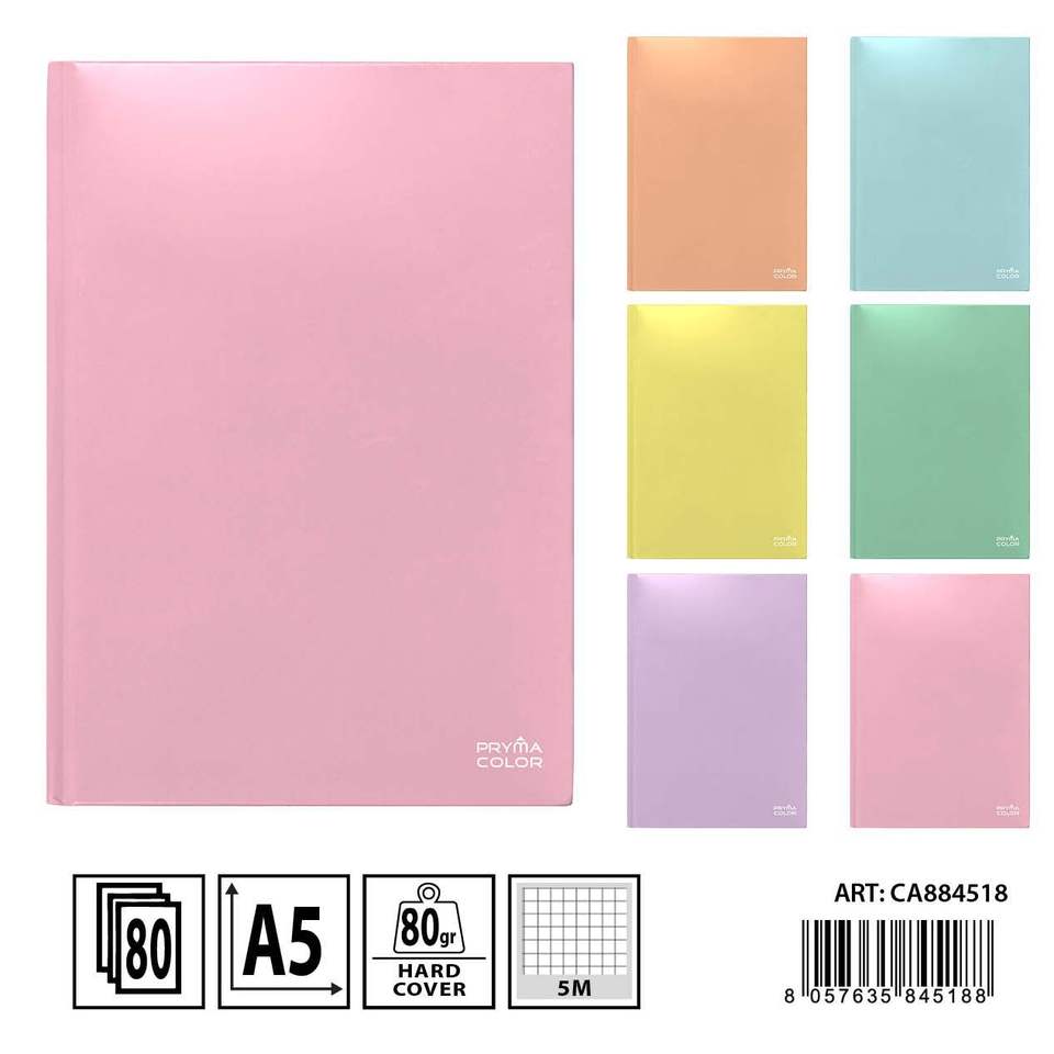 Cuaderno Rígido de Color Macaron Pryma A5, Cuadrícula de 5 mm, 100 Hojas, Térmico, de Cartón, con Espiral, para Uso Escolar