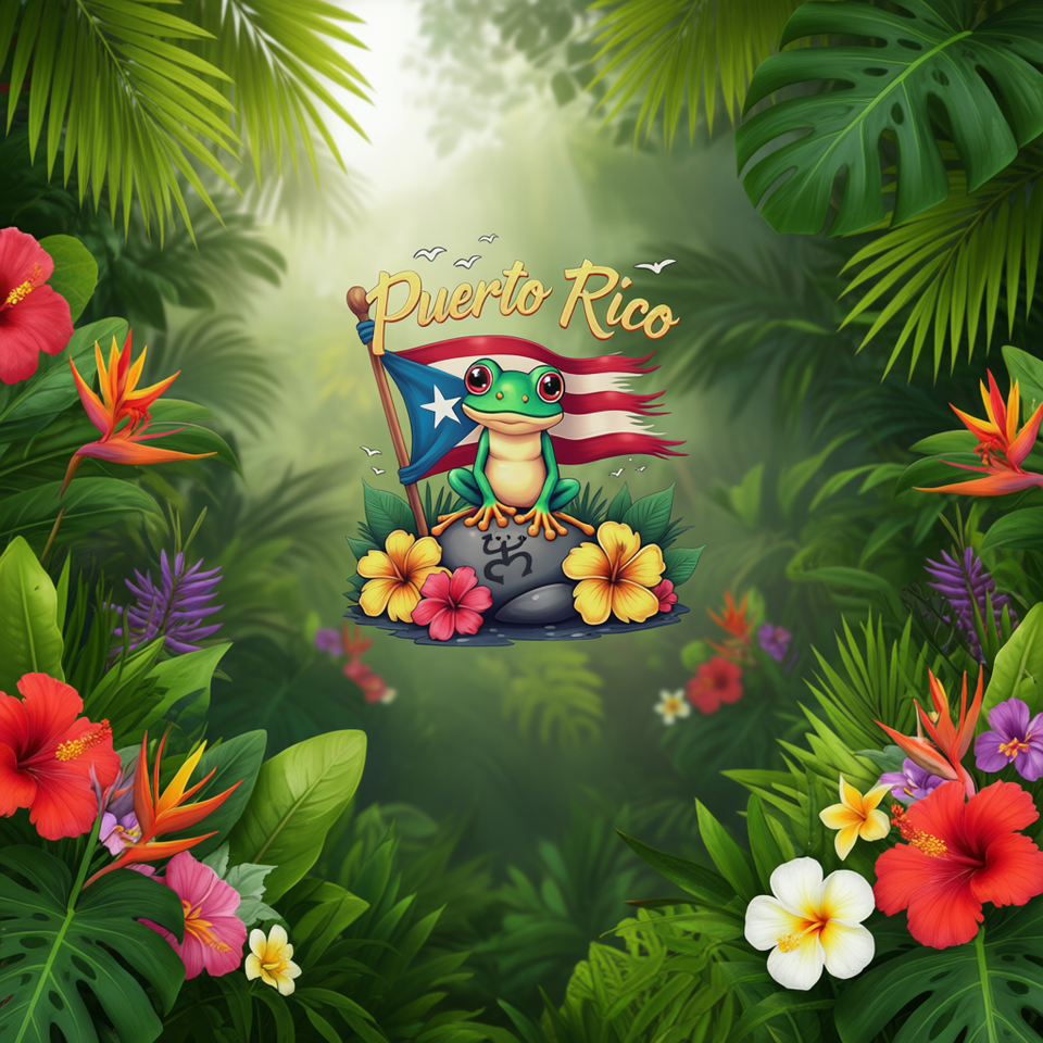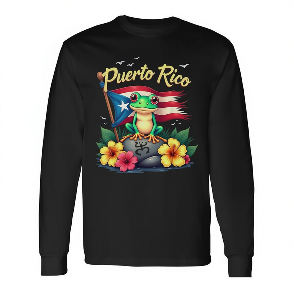 Camiseta de manga larga con diseño de rana Coqui de Puerto Rico con bandera y flores