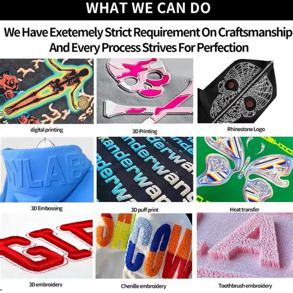Técnicas:Bordado, Impreso, Lavado, Tinte sencillo, Estampado de hojaldre, Bordado 3D, De diamantes de imitación, Otros