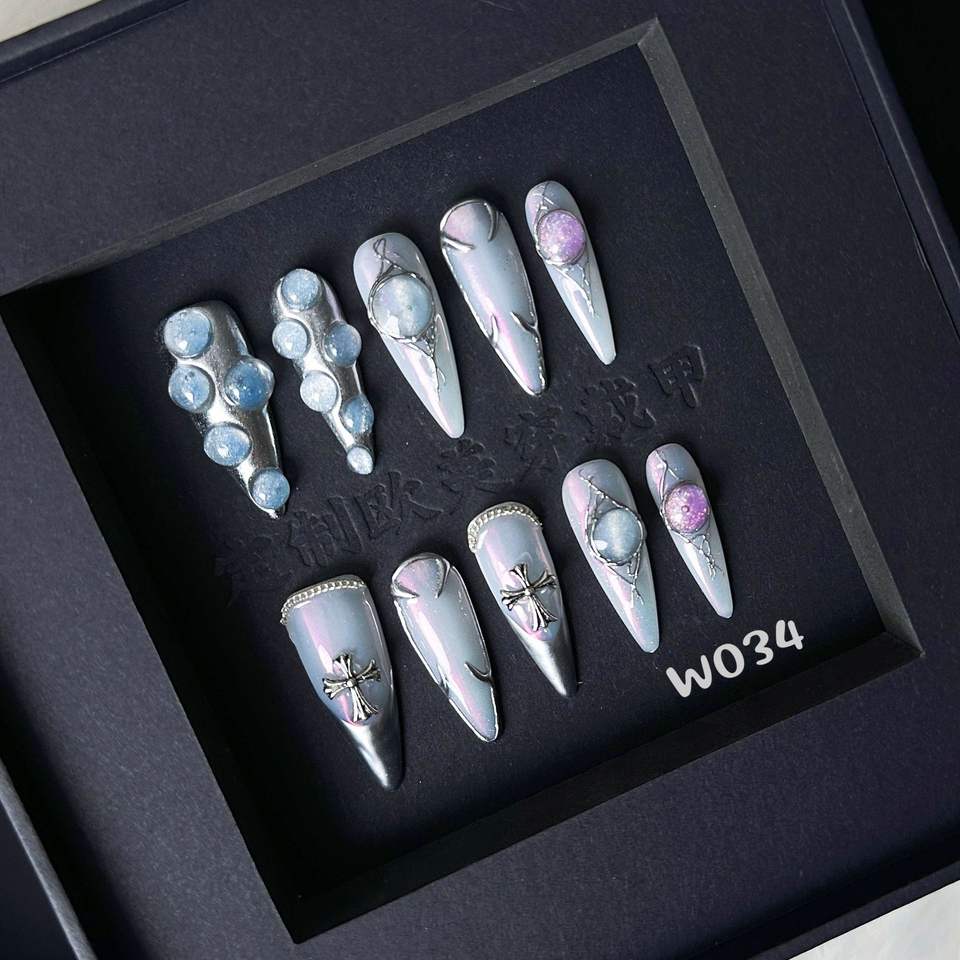 Uñas de Gel 3D Estilo Punk, Personalizadas de Fábrica, Forma Almendrada, Plateadas, Pintadas a Mano, con Dijes Esculpidos en 3D, Uñas Acrílicas de Cobertura Completa, Punta de Uña Cruzada