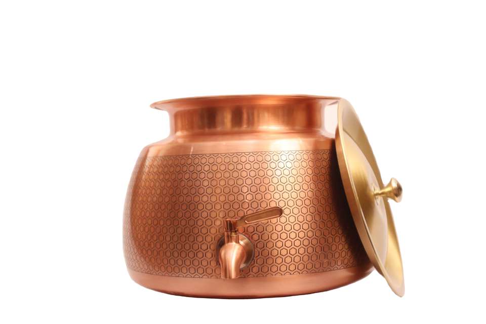 Dispensador de Agua de Cobre Puro con Acabado Anticorrosión, Grifo de Latón Antiderrames y Soporte, 5L/8L/11L, Estilo Tradicional Indio para el Hogar