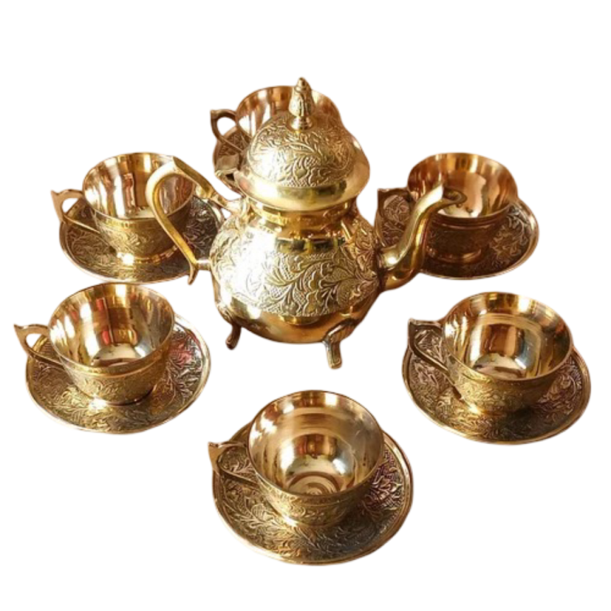 Juego de Té Vintage de Latón Puro con Grabado y Acabado Pulido para Hogar, Restaurante y Hotel, Juego de Café de Metal